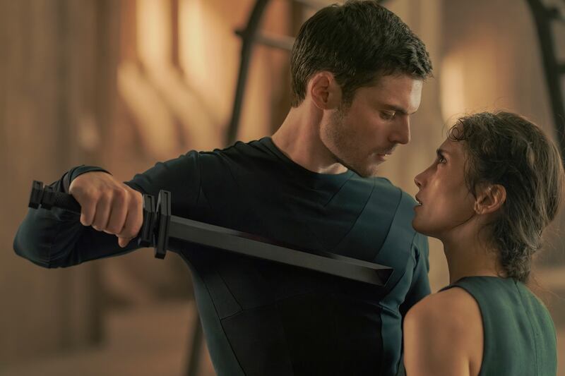 To maintain control of the desert planet Arrakis and its valuable spice, Emperor Javicco Corrino (Mark Strong) has, with the aid of his truthsayer Kasha (Jihae), arranged to have his daughter Ynez (Sarah-Sofie Boussnina) married to the nine-year-old son of a duke whose warships Javicco covets. Because her new husband won’t be ready to rule for some time, Ynez intends to follow up her marriage by relocating to Wallach IX to be trained as a truthsayer, which she’s looking forward to despite the hot fling she’s having with her swordmaster Keiran Atreides (Chris Mason).