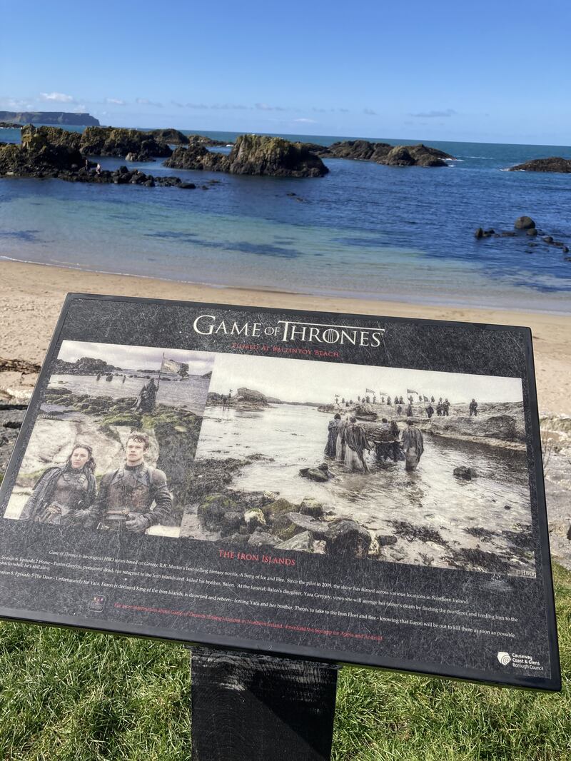 On the day we visited, the bright coastal nook contrasted with the placard that had photos of the muted Greyjoys stronghold, the Iron Island. Yes, Ballintoy appeared several times in Game of Thrones, including in the final season when Varys met his fiery end.
