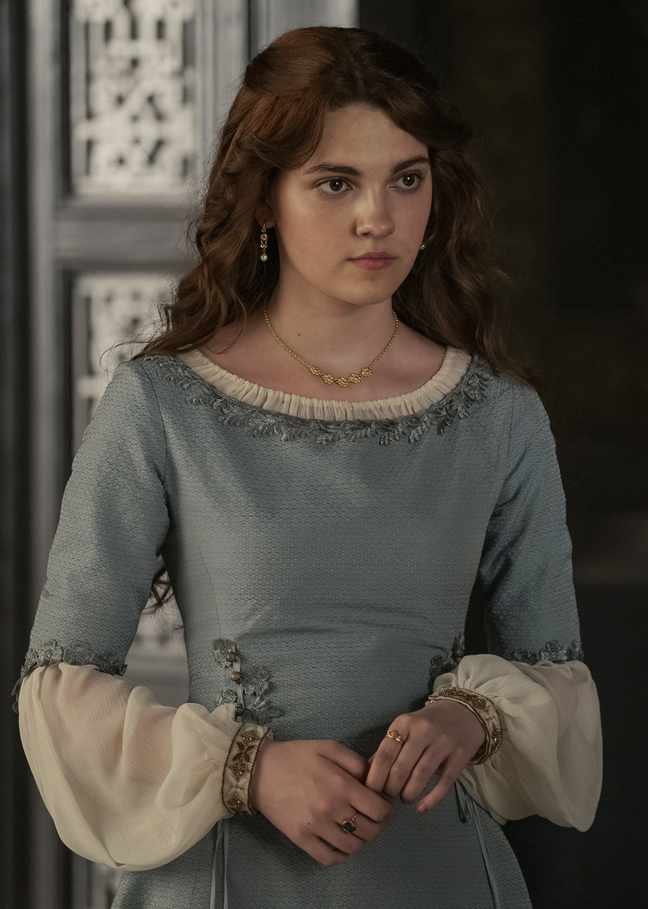 I’m glad you brought up Alicent’s transformation. Her clothing, at first, definitely signifies her status as a member of court, with chiffons and lovely draped gowns, but it’s also age-appropriate, since she’s only 15 or 16 when we meet her, as is Rhaenyra. But then her style becomes—I don’t want to say “sexy,” because we’re talking about a teenager.