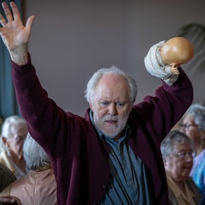 In the aftermath of a great war that turned civilization into smoldering ruins, the remainder of mankind lives in a walled-off city run by the Overlord (Jacek Dzisiewicz), who’s on the verge of death. Angling to fill the forthcoming power vacuum left by his demise is Patriarch Johan (Fraser James), a religious villain who commands a bloodthirsty cult, and Queen Melange (Amara Okereke), who’s yet to provide her elderly spouse with an heir.