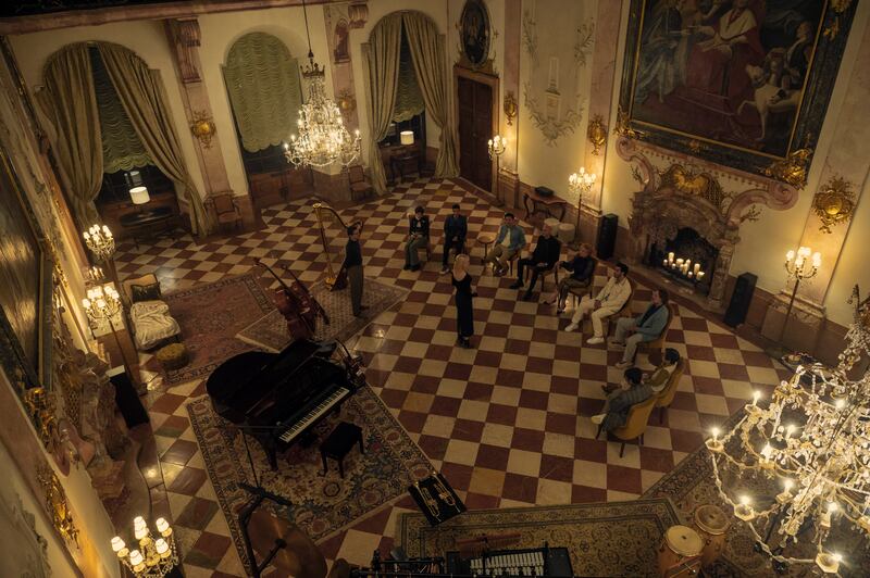 Golding says it was a life imitating art situation: “You’ve got to start with the room. We went to a beautiful castle-slash-mansion in Salzburg. It was so decadent. They filled it with the most amazing props—grand pianos, cellos.” Baranski shares that this location has movie musical legend status, as The Sound of Music also filmed at this particular Alpine spot.
