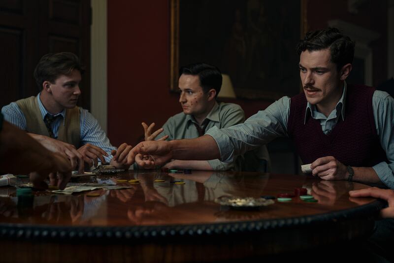 Rosie gets a break from the B-17s when he and his surviving crew are sent to an idyllic manor house known by the airmen as a “flak house.” There, they ditch their leather bomber jackets for off-duty attire and luxury digs. Think Saltburn but without the naked dancing and hedonistic parties. While Rosie bristles at being taken away from combat, Mann relished the opportunity: “To not have the uniform anymore, but to be in this different kind of environment brings a level of richness to it and shakes things up on our end in such an interesting way.”