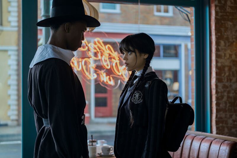The annual fete is apparently designed to ease tensions between the “outcasts” and the “normies”—who live in Jericho, founded by early settler Joseph Crackstone. Convinced that Crackstone is connected to a series of visions she’s been having—this Wednesday Addams is also a bit clairvoyant—Wednesday takes a post at the historical amusement park Pilgrim World.