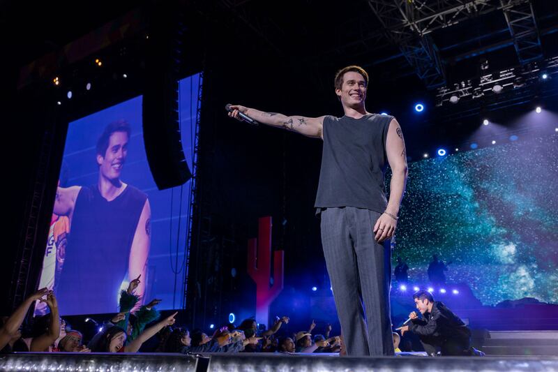 Wait, you don’t know Hayes Campbell? The Hayes Campbell? As in, 24-year-old frontman for August Moon, dreamboat and womanizer extraordinaire? Yeah, that’s him. After five minutes in his trailer, Solène is smitten—but Hayes even more so. The connection is instant. We feel it as much as the characters do. They lock eyes again at a VIP ticket holders meet-and-greet; then, Hayes is on the Coachella mainstage singing odes to a woman he just met. “I know that you’re a little bit older,” Hayes croons, “but baby, rest your head on my shoulder.” We can guess who that’s about!