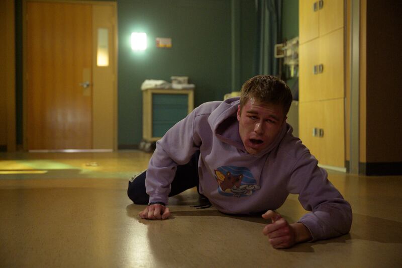 Let the carnage begin. Erik is covered in tattoos and piercings, the latter of which are disgusting cannon fodder for the MRI. The magnetization has become so strong that adjoining rooms in the hospital begin to shake, and there’s no chance Erik can escape, especially since he’s covered in metal. Finally realizing the power of the MRI machine (in fairness, he’s been distracted by his peanut-eating, slowly dying brother), Erik tries to leave, but he stops dead in his tracks.