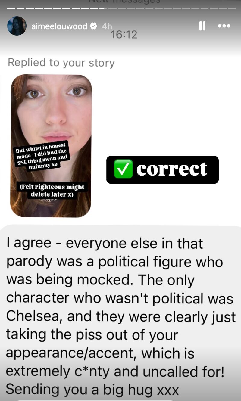 “Everyone else in that parody was a political figure who was being mocked. The only character who wasn’t political was Chelsea, and they were clearly just taking the piss out of your appearance,” one message read, to which Wood replied, “Correct.”