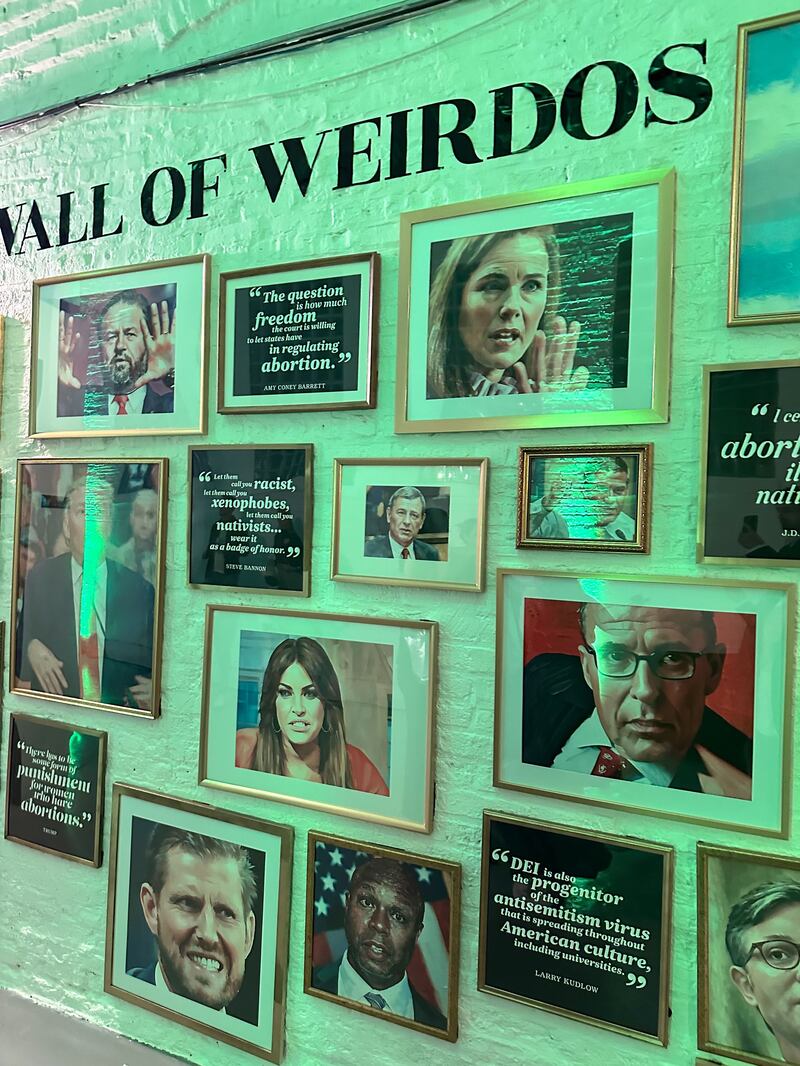 Corbin Bolies/The Daily BeastAnother wall had the “Hall of Hotties,” including prints of Harris, Walz, and—again, oddly—NFL star Jason Kelce. Travis and Taylor Swift’s images didn’t make the cut, but those of Charli XCX, Ariana Grande, Olivia Rodrigo, and Beto O’Rourke did.