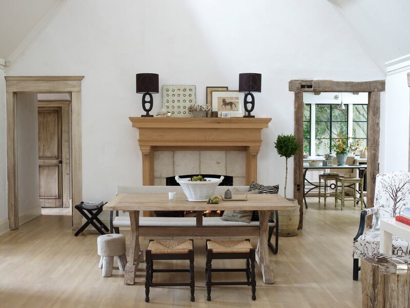Uneven beams, reclaimed from a North Carolina tobacco farm, frame the doorway leading from the open-plan living room to the dining room.
