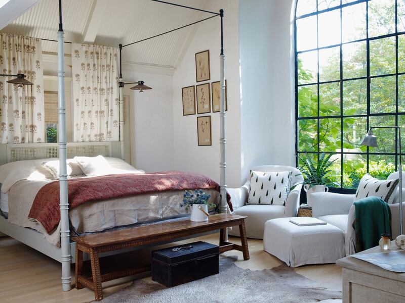 A 22-foot-high window bathes the master bedroom and its four-poster bed in sunlight. The lush backyard can be seen through the window as well.
