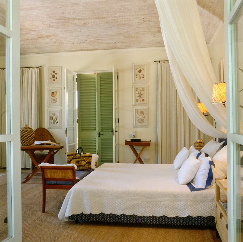 Nauticals and neutrals perfectly blend in one of several guest bedrooms, where shuttered doors lead onto one of many terraces.