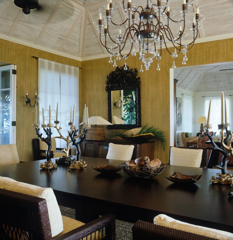 Grass wallpaper and wicker chairs add a beachy spin to the decadence of classic light fixtures and a 1940s-style French table in the dining room.