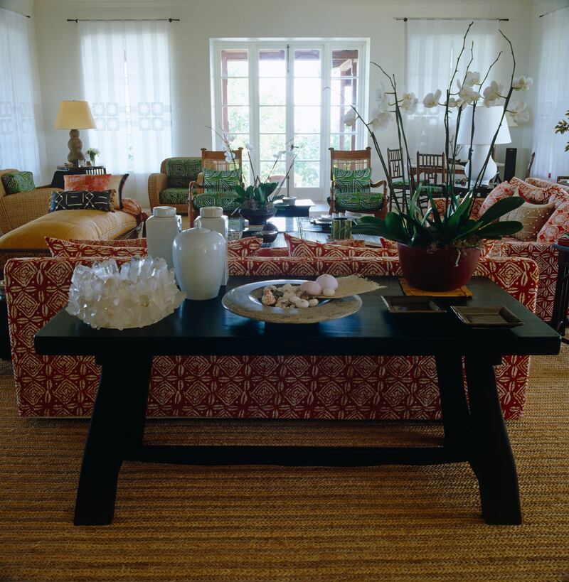 Bold patterns share the spotlight with an Indonesian table displaying Californian crystals, orchids, and a cluster of Asian ceramics in this beautifully lit sitting room.