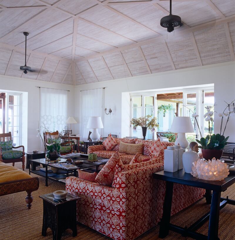 African-batik couches and scattered dark-wood tables serve as warm anchors for the living room’s soaring, vaulted ceiling.