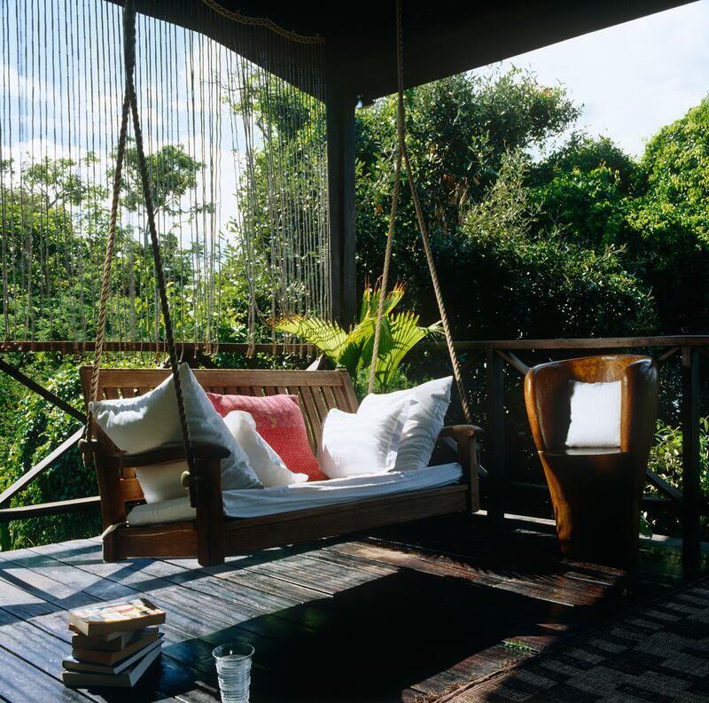 At one end of the terrace, a suspended bench and modern, sculptural chair are tempting spots for an afternoon lounging near the treetops.