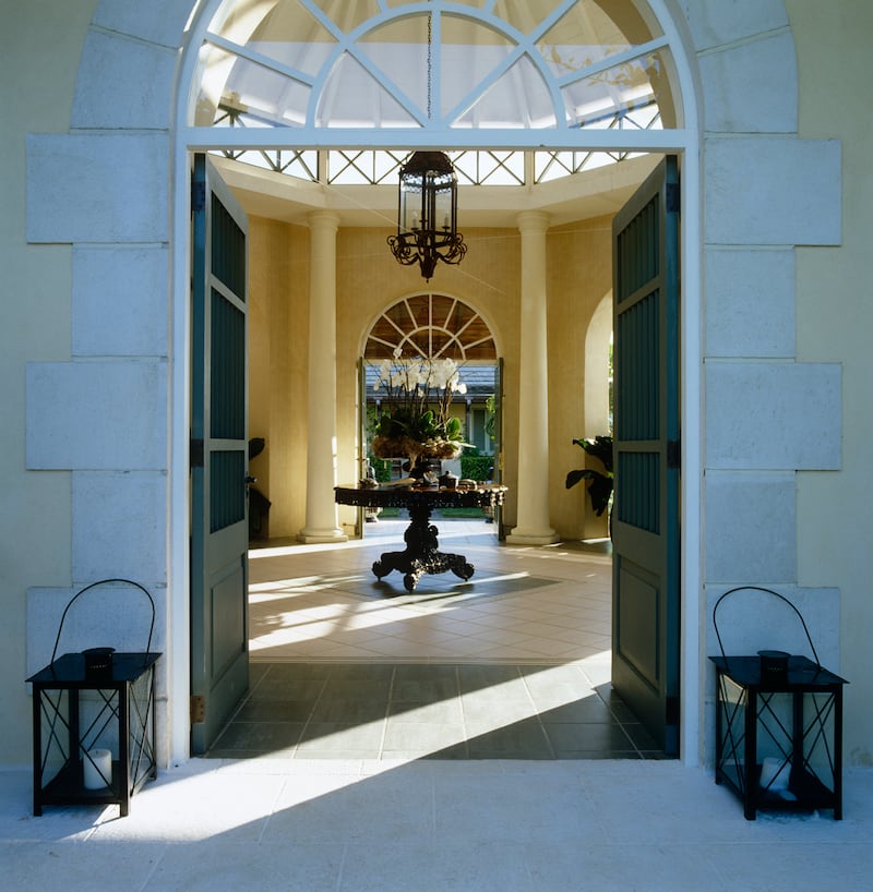 Stately, clean lines get a dose of island chic at the entrance to the beach house, with the coral stone steps amplifying the island’s already-intense natural blue and green hues.