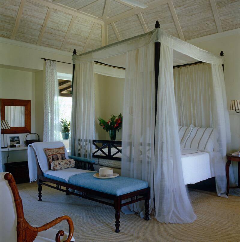 In the guest bedroom, a deep mahogany bed frame is draped with dreamy white voile bed-hangings.