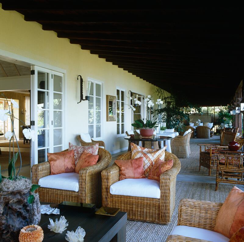 In the shade of a paved terrace, wicker couches and chairs offer a dash of beachfront elegance.