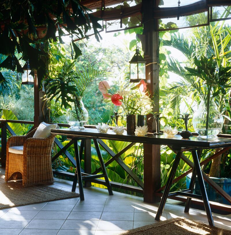 The strong lines of a Chinese-inspired table provide a striking, fresh contrast to the mass of foliage in the garden below.