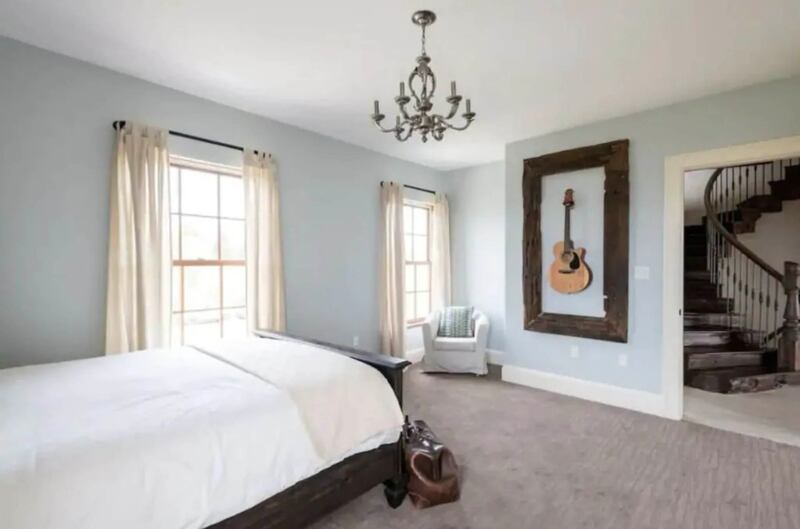 The house sleeps 10, so it is the perfect spot for a getaway with your dearest group of friends. (Or, at least, the ones you trust the most to be vaccinated.) But we all know how perilous vacations can be, what with having to divvy up the rooms. Here, things are a little easier given the presence of two master bedrooms. This one has a musical touch and a view of the wooden spiral staircase that leads to the second floor.