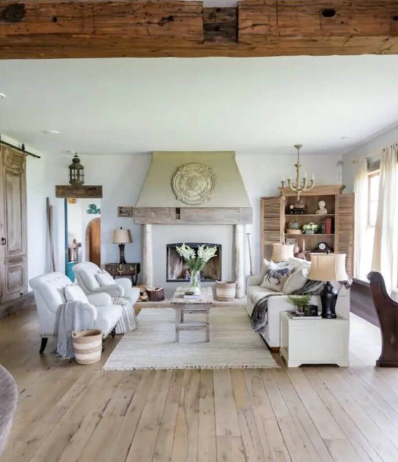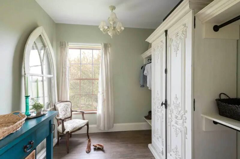 It’s not just the grounds that are inspired by the French countryside (think an apple grove and outbuildings described as “adorable”). This bedroom, one of five, screams: hello, shabby chic!