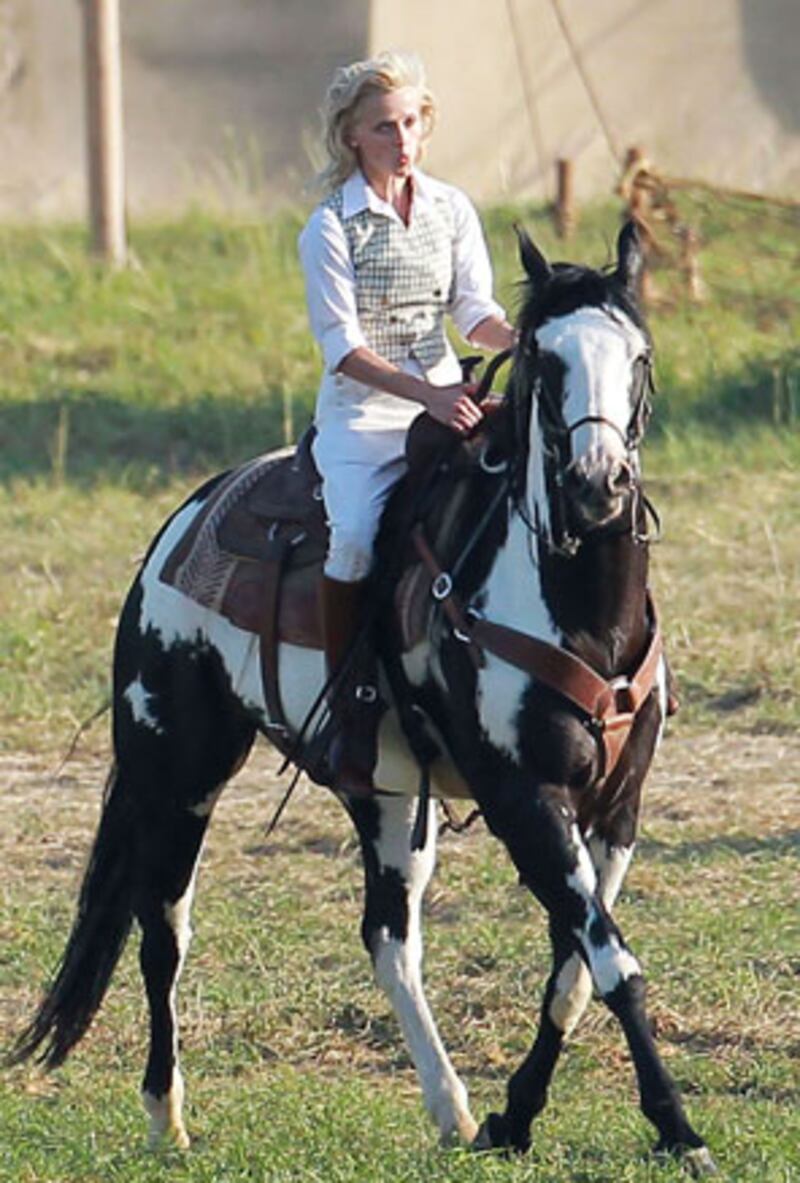 Southern girl Reese Witherspoon looked right at home as she sat atop a beautiful horse in a checkered vest and white ensemble on the set of her upcoming movie Water for Elephants. In the Great Depression-set film, based on Sara Gruen’s book of the same name, Witherspoon plays Marlena, a star circus performer with an affinity for horses, who is married to the head trainer, August. Though Witherspoon clearly knows how to rough it on set, her signature blond 1930s curls are perfectly in place.