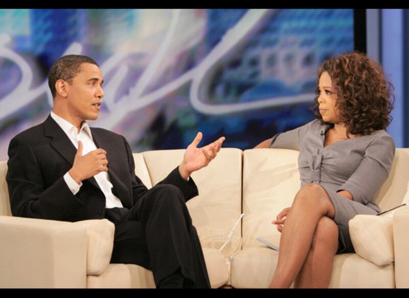 After Senator Barack Obama first came on the show in October 2006, Winfrey urged him to run for president. In a gray flannel dress by Alexander McQueen, Oprah questioned Obama about his plans for the future.