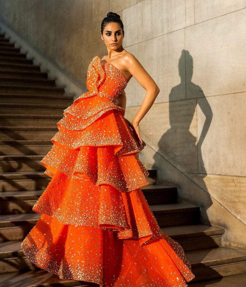 He created sequined embroideries on fly-away materials in delicate colors, as well as a more out-there orange dress, covered in silver glitter. It looked as if it was designed for a Bollywood parade.
