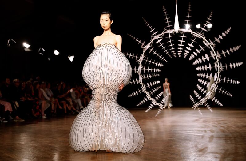 The design genius of couture week, Dutch designer Iris van Herpen created some of her iconic designs in curious and wonderful shapes that seem to mirror the fins of delicate sea creatures. They belong as much to the world of design as clothing. Pure art.