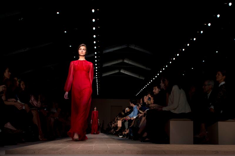 Valentino designers Maria Grazia Chiuri and Pierpaolo Piccioli presented a feminine and modest collection on Tuesday, filled with A-line dresses, delicate details and embroideries, and ethereal fabrics that swept over the runway. Dresses came in several shades of ivory, pink, and of course—signature Valentino red.