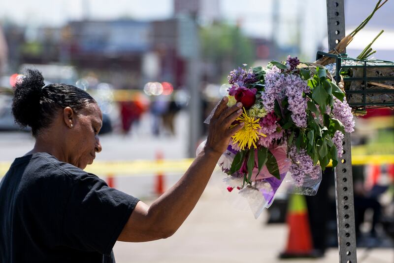Jeanne LeGall of Buffalo pays her respects at a makeshift memorial at Tops Friendly Market on Sunday.