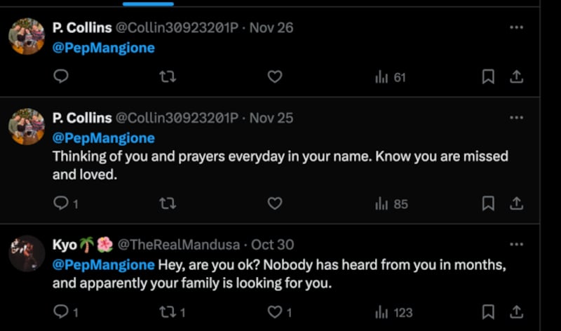 “@PepMangione Hey, are you ok? Nobody has heard from you in months, and apparently your family is looking for you,” wrote X user @TheRealMandusa on Oct. 30 on the platform.