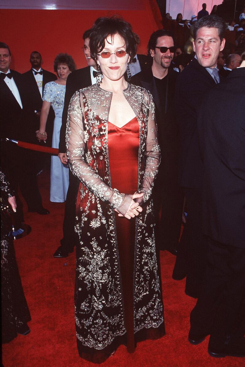 In a red silk dress, embroidered jacket, and tinted sunglasses at the Academy Awards in 1998.