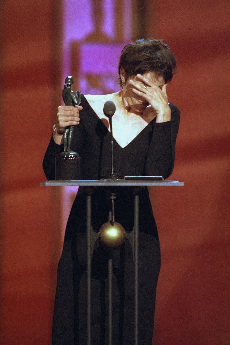 Onstage accepting her award for best female actor in a leading role, also for her role in Fargo, at the SAG Awards in 1997.