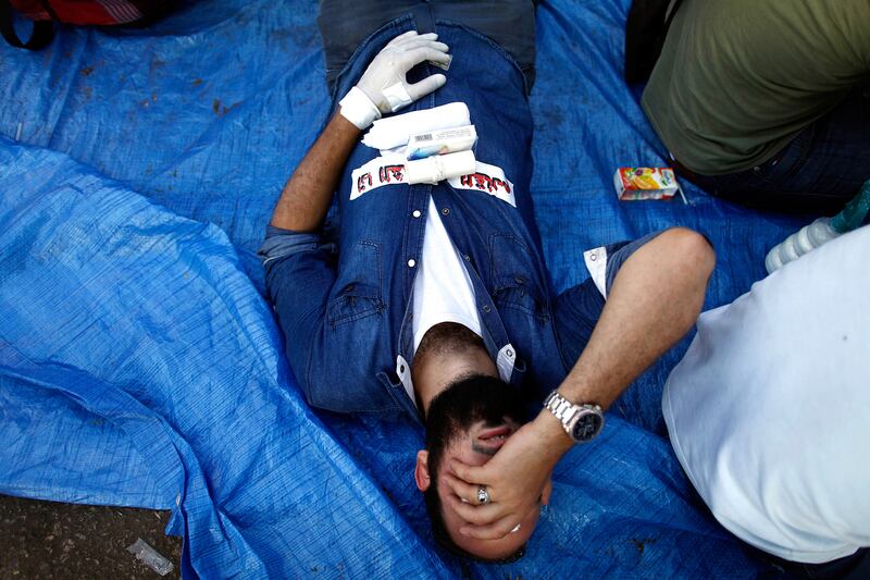 Chaos reigned as Cairo’s hospitals were overwhelmed with wounded Morsi supporters early Monday. A Health Ministry official estimated 435 were injured in the shootout. Here, an injured man receiving treatment grips his bandaged chest.
