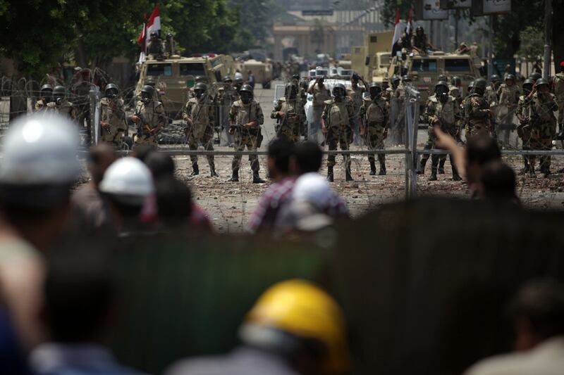 As the smoke cleared and the sun rose, a row of Egyptian Army guards stands poised outside the Republican Guard building in Nasr City in Cairo.