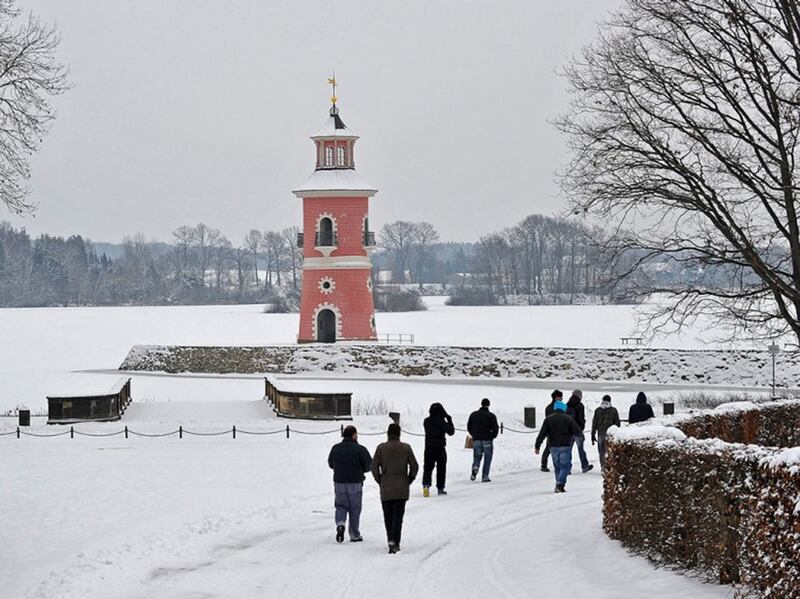 People walk past the iconic, 18th-century lighthouse near Moritzburg Castle, right outside of Dresden.