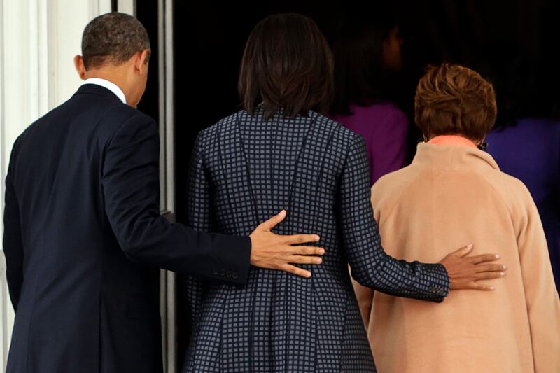 President Obama arrives back at the White House with first lady Michelle Obama and her mother, Marian Robinson, after attending service at St. John's Episcopal Church on Monday.