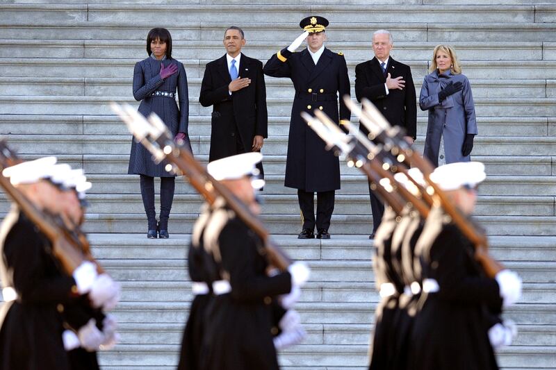 Barack and Michele Obama (L), Army Major General Michael Linnington, Joe and Jill Biden place their hands over their hearts as they review the troops at the start of the inaugural parade.