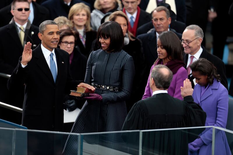 Barack Obama, takes the oath of office from Supreme Court Chief Justice John Roberts, right, as first lady Michelle Obama holds the Lincoln Bible and the traveling bible of slain civil rights leader Martin Luther King Jr. during the presidential inauguration.