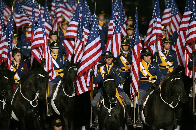 Mounted members of the military ride horses as the presidential inaugural parade winds through the nation's capital.