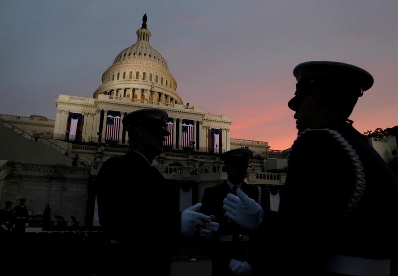 US Coast Guard personnel stand post at the U.S. Capitol at dawn prior to the inaugural ceremony.