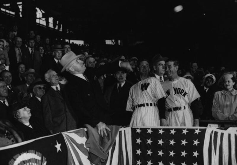 Truman, seen here at an opening day between the Washington Senators and the New York Yankees, was the first southpaw president to throw out a first pitch. He also attended more baseball games than any other president in history, but based on his aim here, he obviously believed in the high heat.