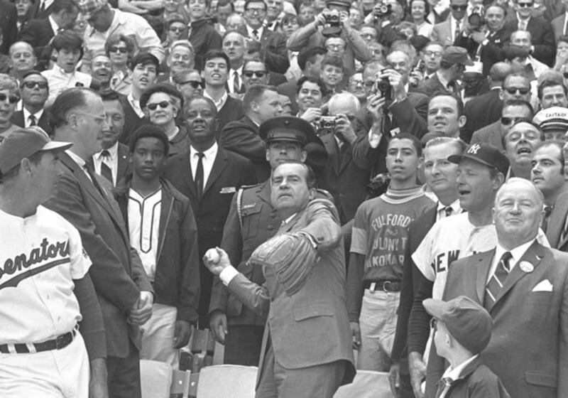 President Nixon threw out the pitch in 1969 on the American League’s opening day. Years before, Harry Truman warned his friend, Washington Senators owner Clark Griffith, of Tricky Dick via telegram: "BEST OF LUCK TO YOU ON OPENING DAY AND EVERY DAY. WATCH OUT FOR THAT NIXON. DON'T LET HIM THROW YOU A CURVE. YOUR FRIEND, HARRY TRUMAN."