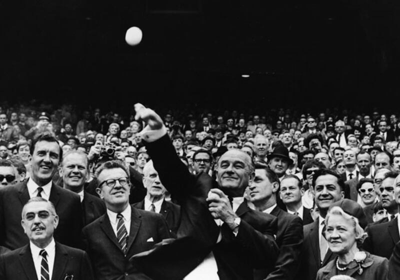 Among the nattily dressed crowd observing Johnson’s first pitch of the 1967 season are future President Gerald Ford and Senator Edmund Muskie. Note LBJ’s left hand—the 36th President apparenty tried to employ the ol’ hidden ball trick.