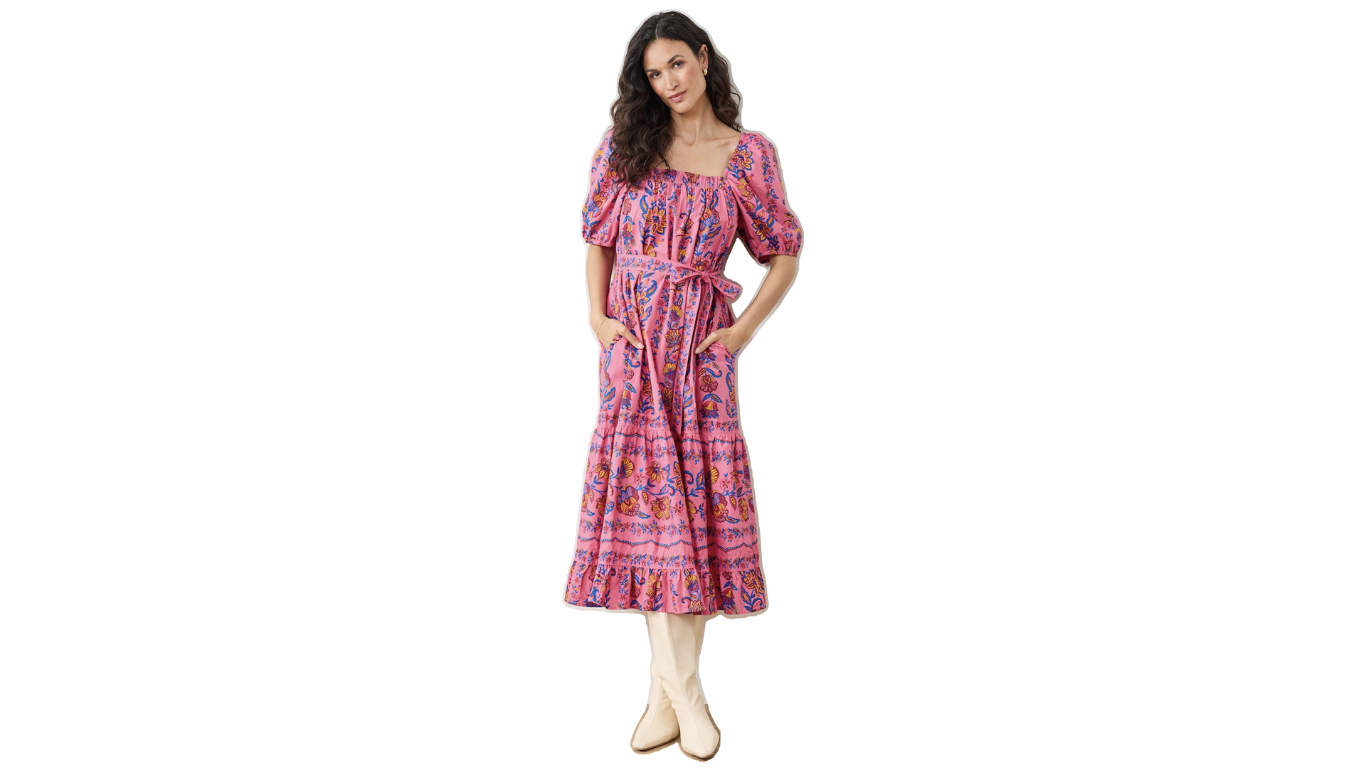With puff sleeves, a flutter hem, and an adjustable belt, this square-neck dress channels prairie charm. Finish the look with your favorite pair of cowboy boots.
