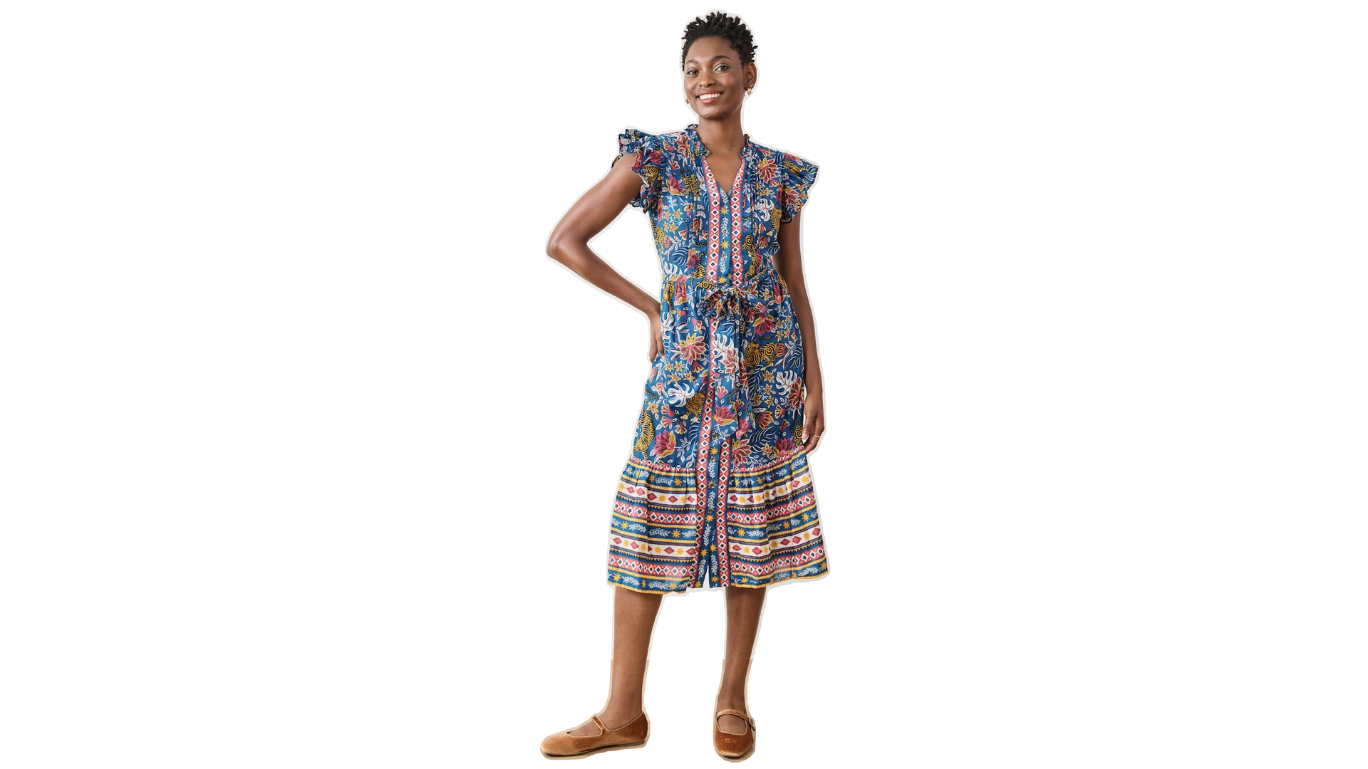 The lush foliage and beautiful tiger cats of this striking blue dress create a surprisingly neutral palette. With pintuck pleats and flutter sleeves, it’s the kind of dress that makes people ask where you got it.