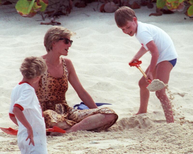 Princess Diana is covered in sand by her son Prince William during a private beach holiday on Necker Island in the British Virgin Islands in 1990