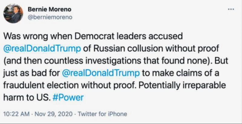 In a now-deleted December 2020 tweet, Moreno said it was wrong when Democrats accused Trump of collusion with Russia, “but just as bad for [Trump] to make claims of a fraudulent election without proof. Potentially irreparable harm to US.”