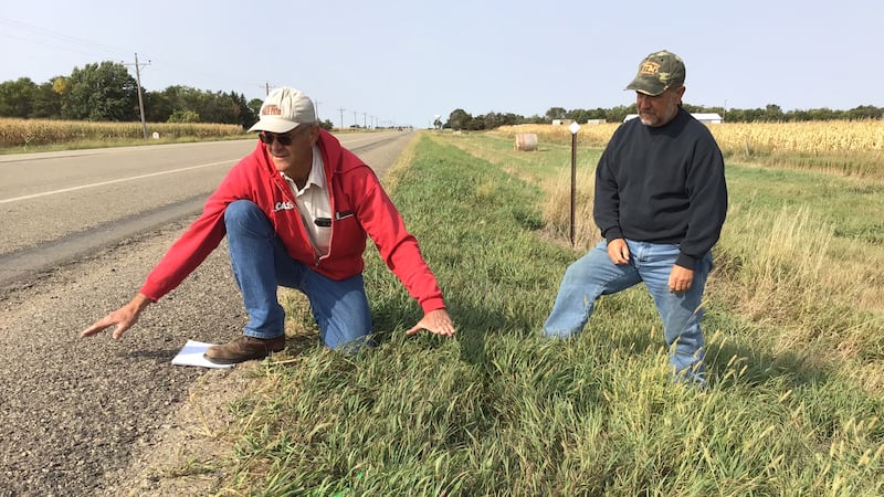 Nick Nemec, in red, and his brother, Victor, at the site where their cousin Joe Boever was struck and killed by South Dakota Attorney General Jason Ravnsborg on Sept. 12.