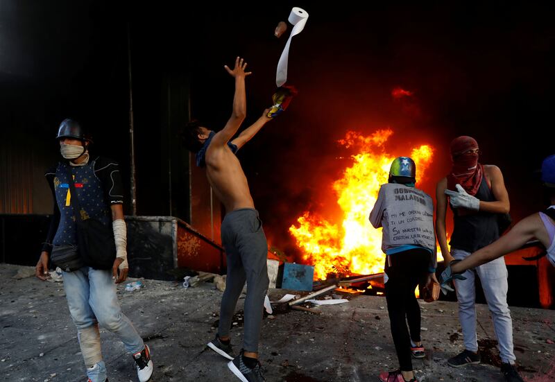 Protesters react in front of a fire burning at the entrance of a building, housing the magistracy of the Supreme Court of Justice and a bank branch, during a rally against Venezuela's President Nicolas Maduro, in Caracas.